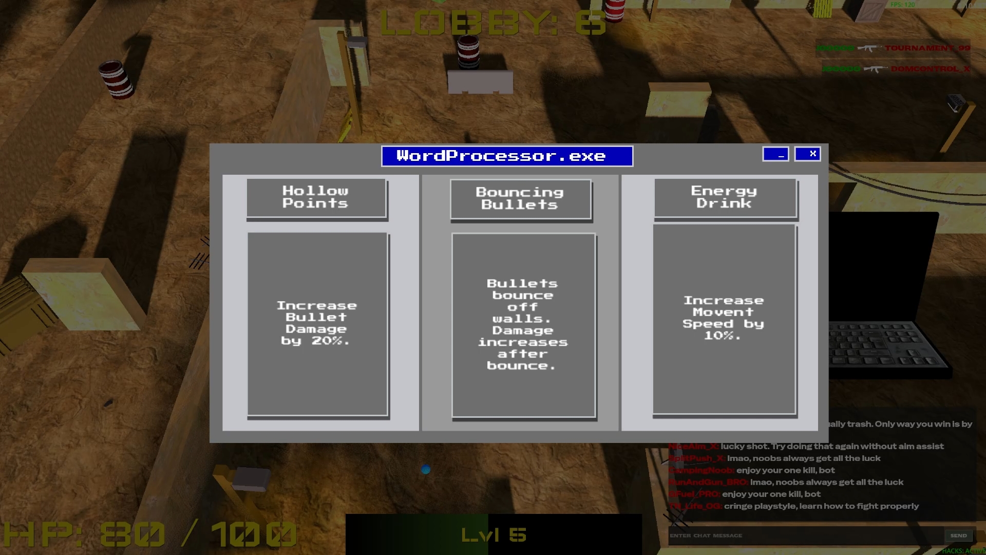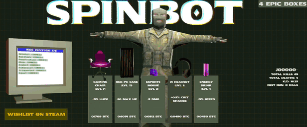 Spinbot is a roguelike survival game where you’ll blast and cheat your way through lobbies of unsuspecting players. Find loot cases, sell the skins, and upgrade your PC and your WordProcessor.exe with a little help from your girlfriend, Carla. How far will you get?